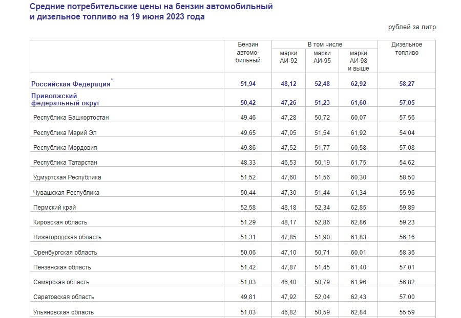 «За период с 14 по 19 июня рост цен на бензин автомобильный был зафиксирован в 72 субъектах Российской Федерации. Более всего он подорожал в республиках Тыва и Дагестан — на 2,6% и 2,3% соответственно. Снижение цен на бензин автомобильный было зафиксировано в Тверской области — на 0,1%», — уточнили в федеральной службе.