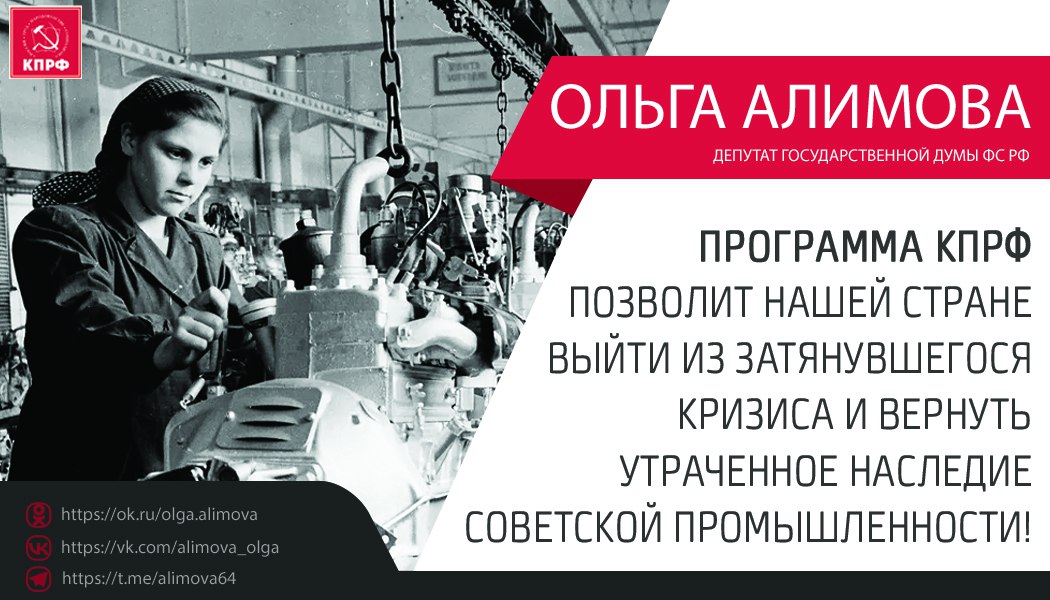Ольга Алимова: «Программа КПРФ позволит нашей стране выйти из затянувшегося кризиса и вернуть утраченное наследие советской промышленности!»