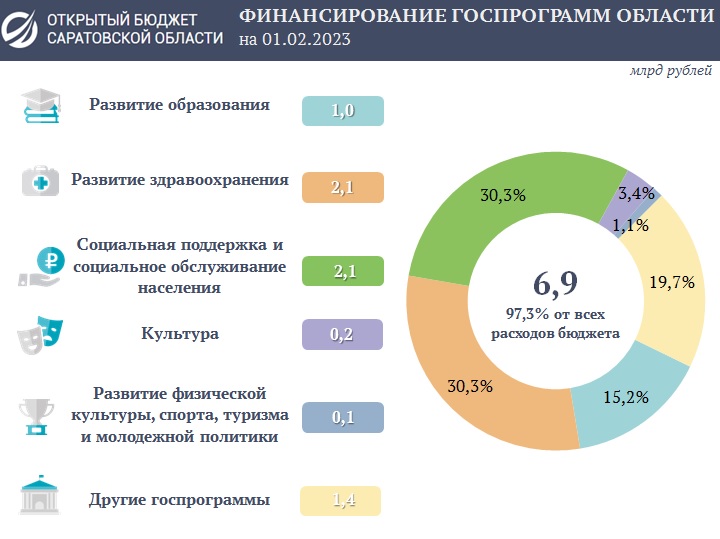На финансирование 20 государственных программ Саратовской области направлено 6,9 млрд рублей, или 97,3% от совокупных расходов областного бюджета на 1 февраля 2023 года.