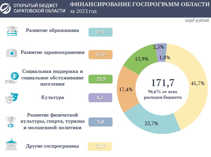 На финансирование 20 государственных программ Саратовской области за 2023 год направлено 171,7 млрд рублей, или 96,6% от совокупных расходов областного бюджета.