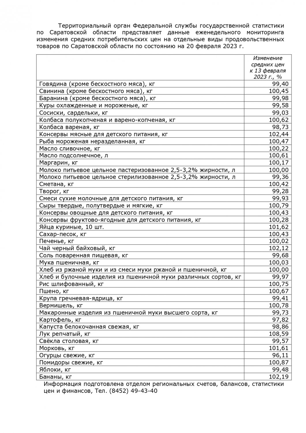 Статистики подсчитали изменения средних потребительских цен на отдельные виды продовольственных товаров в регионе по состоянию на 20 февраля, сравнив их с ценами недельной давности . Как выяснилось, подорожал лук — на 8,59%, консервы мясные для детского питания — на 2,44%, бананы — на 2,19%, чёрный байховый чай — на 2,12%. Яйца подорожали на 1,62%, морковь — на 1,61%. Подешевевших более чем на процент продукта оказалось четыре. Ощутимее всего снизилась цена на огурцы — на 3,89%, картофель — на 2,18%. На 1,27% стала дешевле варёная колбаса, на 1,27% — капуста.