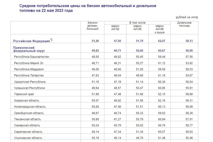 В Саратовской области за прошедшую неделю немного выросли цены на бензин и солярку. Это следует из официальных данных Росстата, который опубликовал средние потребительские цены на бензин автомобильный и дизельное топливо, актуальные на 22 мая 2023 года.