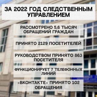 Принято всего 2129 посетителей, что на 11% больше, чем в 2021 году. Руководителем следственного управления и его заместителями в 2022 году принято 863 посетителя.