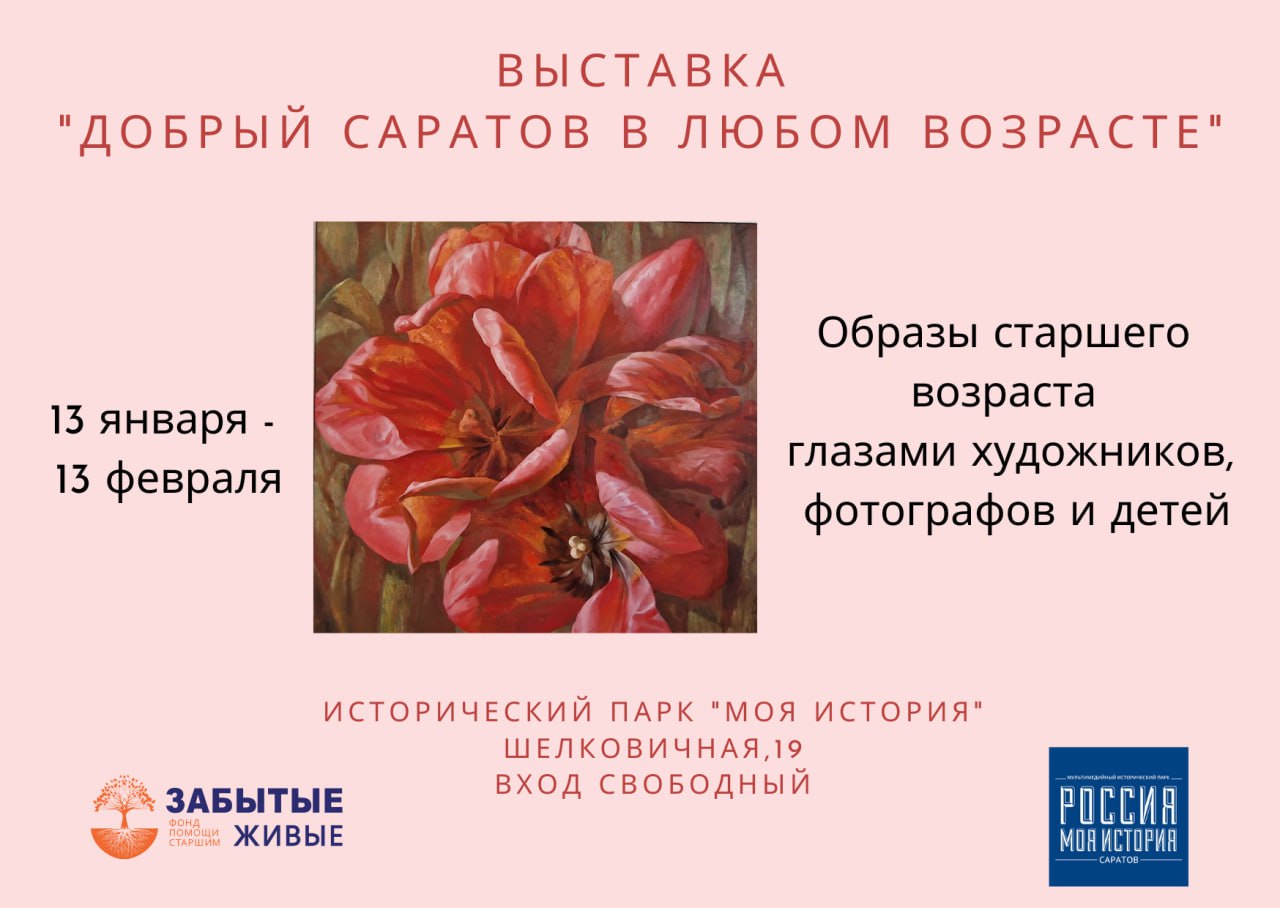 С 13 января по 13 февраля 2023 года в Историческом парке «Россия – Моя история» будет работать выставка «Добрый Саратов в любом возрасте». Организаторы - Фонд социальной поддержки граждан «Забытые живые» совместно с Историческим парком. На выставке будут представлены работы, посвященные «серебряному» возрасту. Об этом сообщает министерство внутренней политики и общественных отношений Саратовской области