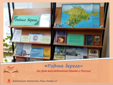 Ко Дню воссоединения Крыма с Россией в читальном зале Центральной городской библиотеки подготовлена и оформлена книжная выставка «Родные берега». На ней представлены материалы, иллюстрирующие историческую связь судеб Крыма и России. Ознакомившись с представленной литературой, можно совершить заочное путешествие по историческим и культурным местам Крыма.