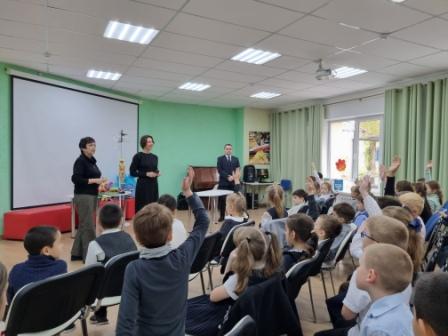 К первоклассникам МОУ «СОШ № 7» пришли заведующая педагогической частью Саратовского театра кукол «Теремок» Марина Мацуцкая и актер Данила Садовский.