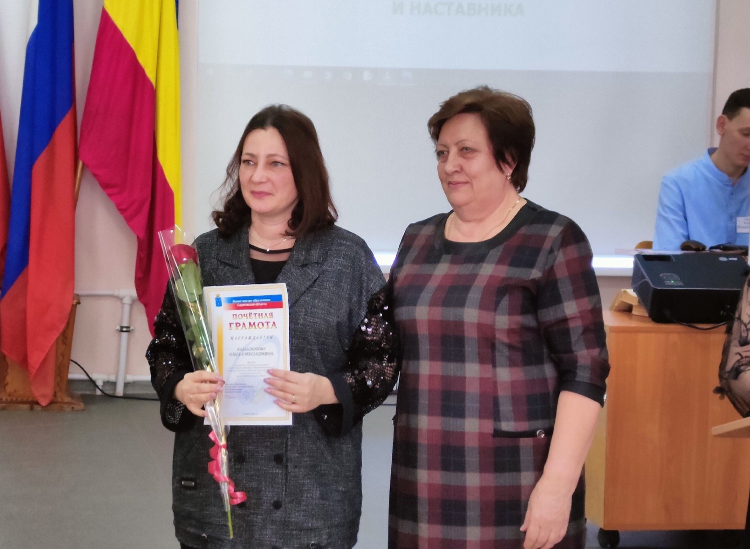 Открытие Года педагога и наставника стало замечательным поводом, чтобы отметить лучших в профессии. В этот день были вручены грамоты и благодарственные письма. Знаком "Классный руководитель - новатор" награждена учитель школы №16 М.А. Иванькова, знаком "Лучший наставник молодёжи" - воспитатель детского сада "Золотой ключик" г. Балашова О. М. Тамалинцева.