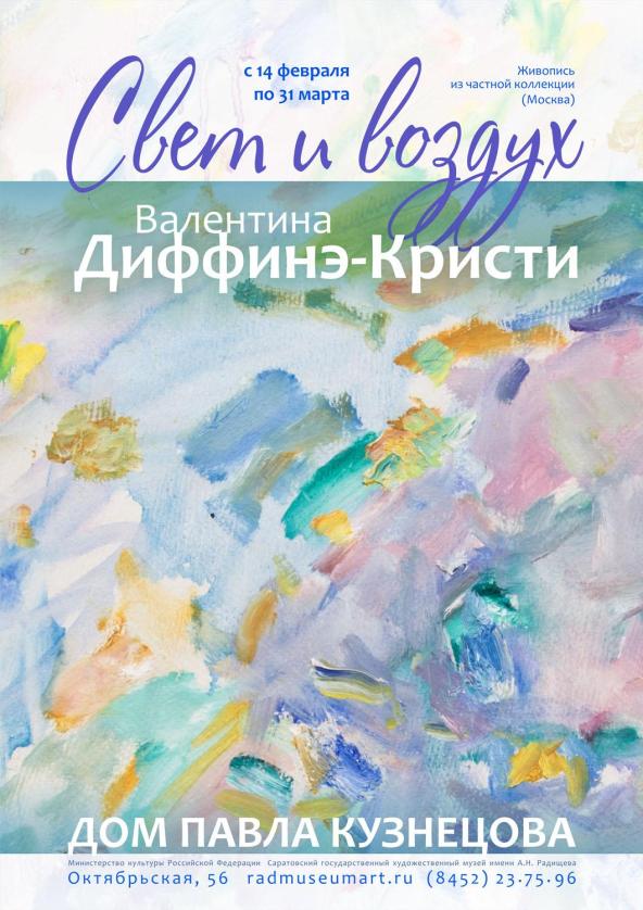 В Дом-музее Кузнецова 14 февраля откроется выставка Валентины Диффинэ-Кристи «Свет и воздух». Выставочный проект «Свет и воздух» многие годы с успехом реализуется в ведущих музеях и галереях России.