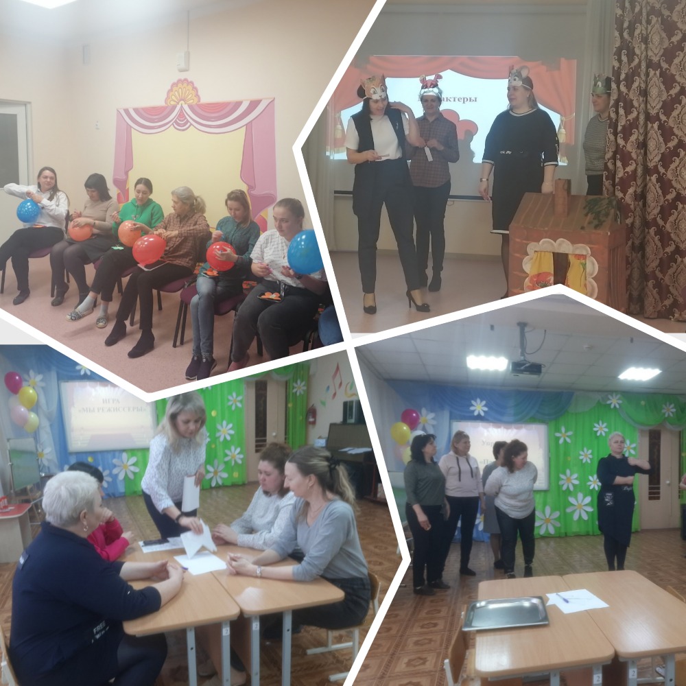 В практической части семинара, воспитатели ДОУ путешествовали по страницам «Волшебной книги», выполняя различные задания «Театральная викторина», «Сказочные предметы», Упражнения на развитие интонационной выразительности, «Пантомима», Театральные этюды, «Мы режиссёры».