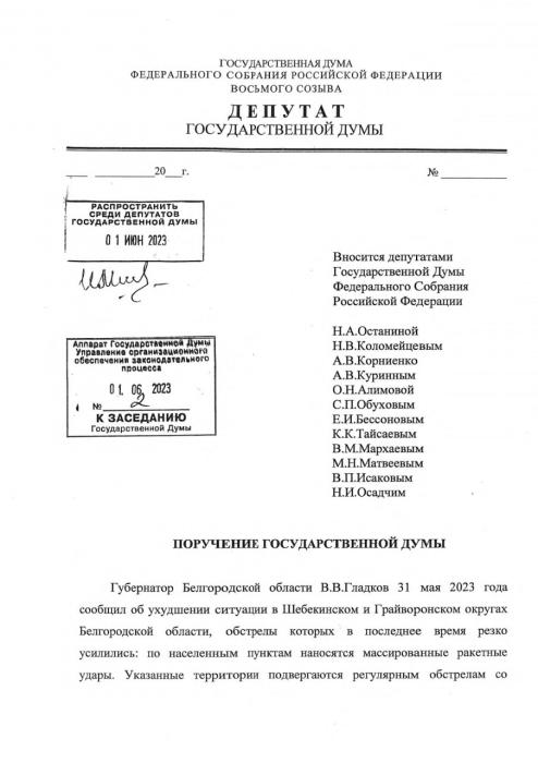 К сожалению, из-за отсутствия в зале председателей профильных комитетов, которые должны выразить согласие или не согласие с проектом, авторами инициативы было принято решение снять проект с рассмотрения и в рабочем порядке направить коллективное письмо депутатов-коммунистов в адрес премьер-министра М.В. Мишустина с требование вмешаться в ситуацию и принять необходимые решения. К сожалению, коллективной позиции Государственной думы по ситуации в Белгородском пограничье с поручением Правительству М.В.Мишустина выработать сегодня не удалось.