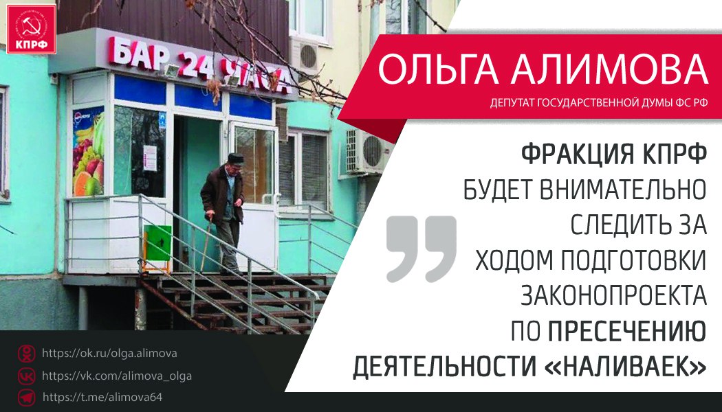 Ольга Алимова: «Фракция КПРФ в Государственной Думе будет внимательно следить за ходом подготовки законопроекта по пресечению деятельности «наливаек»»