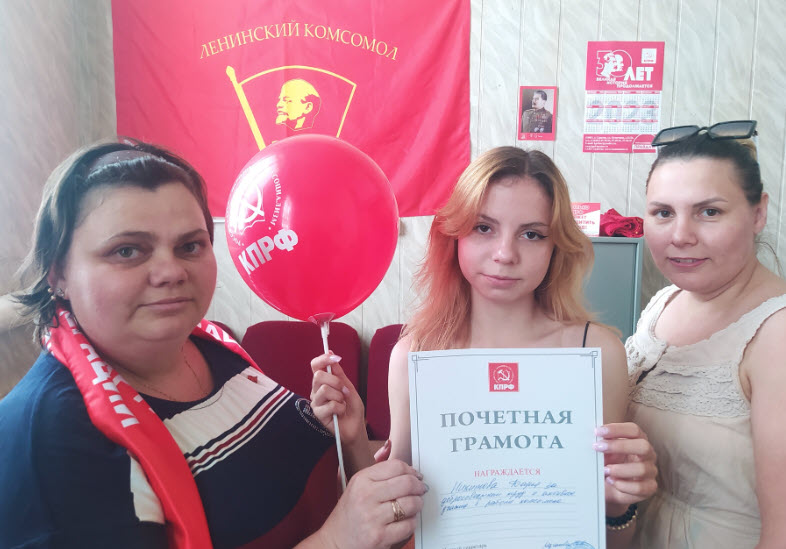 Совещание началось с награждения члена ЛКСМ РФ Никитовой Дарьи Почетной грамотой Екатериновского местного отделения КПРФ «За активное участие во всех мероприятиях райкома, за добросовестную работу в рядах комсомола».