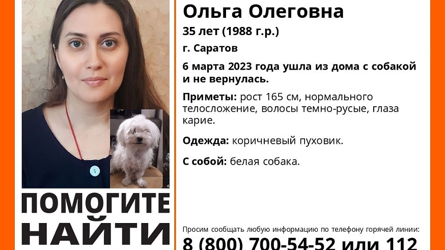 Рост пропавшей женщины 165 сантиметров, она нормального телосложения, у нее темно-русые волосы и карие глаза. Была одета в коричневый пуховик. С собой у саратовчанки была белая собака.