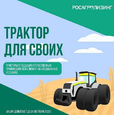 Условия акции «Трактор для своих» следующие: специальные цены на тракторы; срок лизинга - до 7 лет; авансовый платёж - от 0% на все тракторы; отсрочка платежа по основному долгу - до сентября 2024 года (при выборе аннуитетного графика платежей); сокращённый пакет документов; гибкие графики платежей – аннуитетный, регрессивный, сезонный или индивидуальный сезонный.