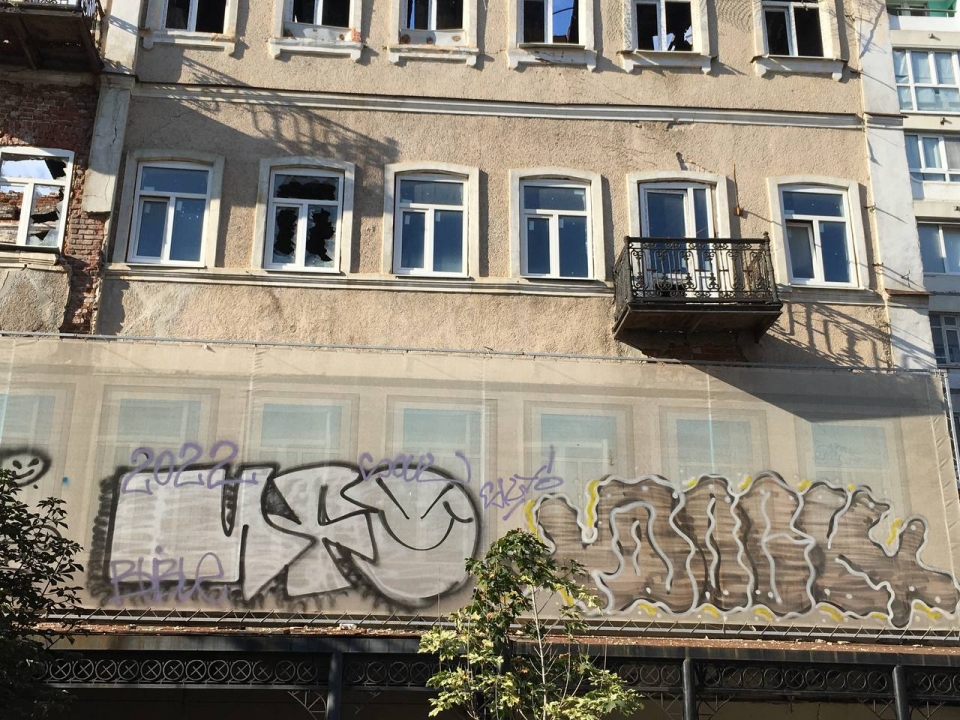 Вчера в центре Саратова, на проспекте Столыпина, неизвестные лица "осуществили порчу муниципального имущества, а именно нанесли граффити на ограждение здания гостиницы "Россия".