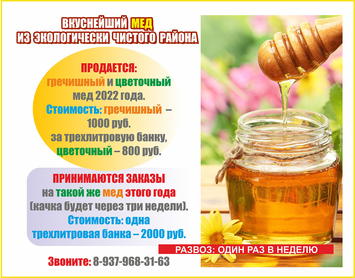 Принимаются заказы на такой же мед этого года (качка будет через три недели). Стоимость: одна трехлитровая банка – 2000 руб.