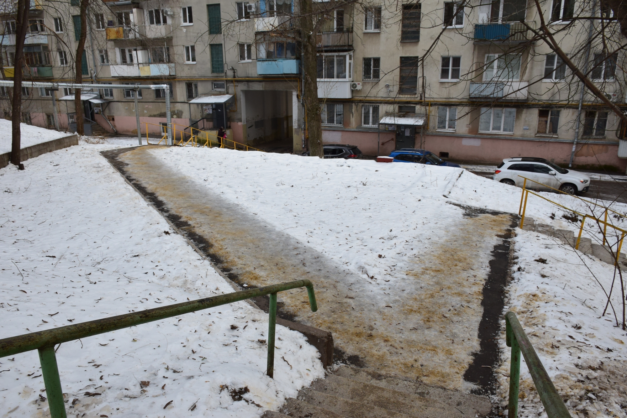 Управляющим компаниям «Волжская-Саратов» и «Хапилин» указано на необходимость усилить работы по обработке территории противогололедными средствами.