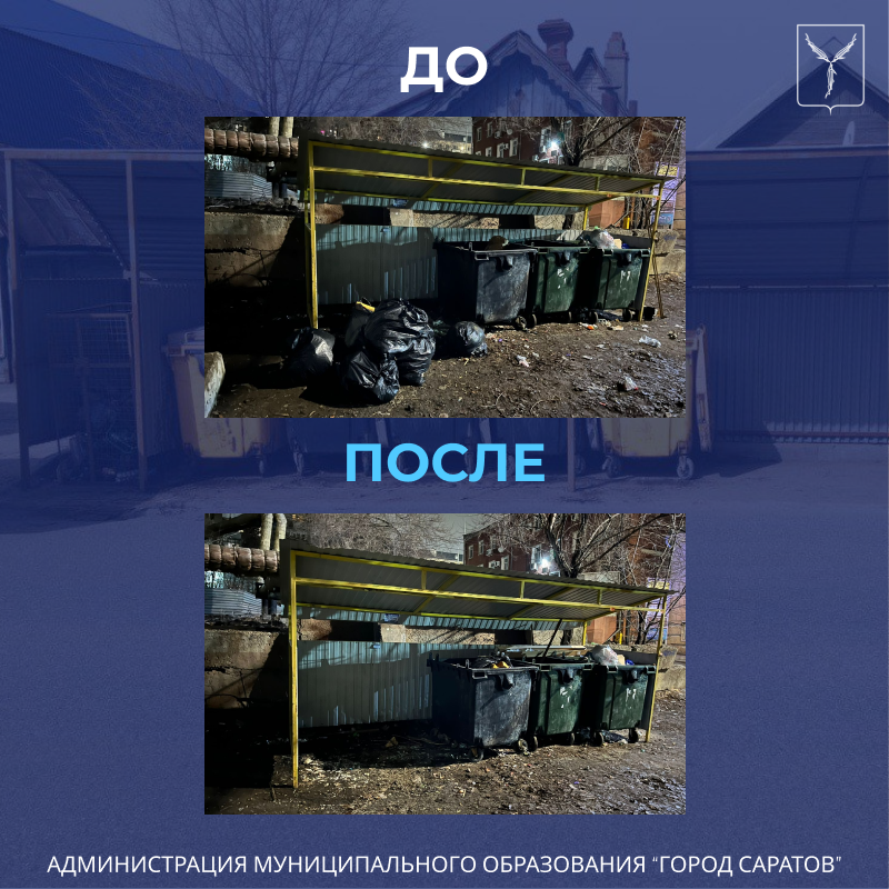 За минувшие сутки очистка и вывоз мусора произведены по улицам: Большая Горная, 245/265, Курдюмская, 63, Динамовская, 14, 1-я Пионерская, 28, Волжская, 5/9, Соколовогорская, 11, Ламповая, 11, Учительская, 5, Вольская, 13, Симбирцева, 40, Вокзальная, 17, Белоглинская, 134 и др.