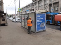 Также силами МБУ «Служба благоустройства Кировского района» выполняются мероприятия по очистке остановочных павильонов, ограждений от граффити и рекламы.