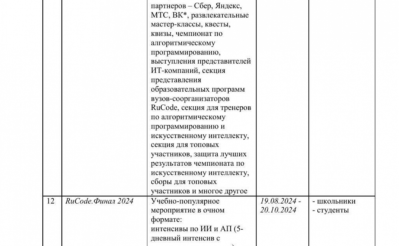 Министерство цифрового развития и связи области информирует о проведении в 2024 году "Всероссийского фестиваля Ru Code по искусственному интеллекту и алгоритмическому программированию. организатором Фестиваля является федеральное государственное автономное образовательное учреждение высшего образования "Московский физико-технический институт. Основными направлениями Фестиваля являются популяризация профессий сферы информационных технологий, в особенности искусственного интеллекта, а также обучение отраслевых специалистов, повышение качества подготовки кадров для ИТ-сферы. В рамках Фестиваля запланированы также профориентационные мероприятия, нацеленные на привлечение заинтересованных участников на обучение по образовательным программам в области искусственного интеллекта (программа Фестиваля прилагается). Чтобы стать участником Фестиваля, необходимо пройти регистрацию на официальном сайте Фестиваля https://rucode.net/. Участие в мероприятиях Фестиваля бесплатное. С подробной информацией о Фестивале можно ознакомиться на официальных информационных ресурсах в сети «Интернет»:. сайт Фестиваля: https://rucode.net/, группа Фестиваля в VK: https://vk.com/rucodefesrival.