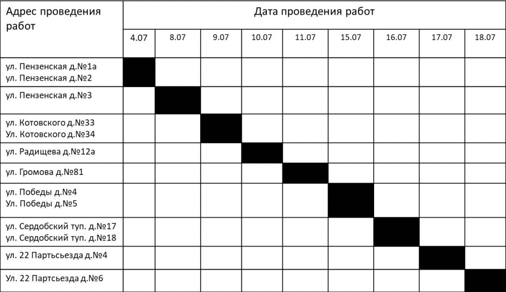 В связи с производством технического обслуживания и ремонтом внутридомового и (или) внутриквартирного газового оборудования в многоквартирных жилых домах до 18.07.24 г. с 9 ч. 00 до завершения работ производится отключение газа в жилых домах в соответствии с прилагаемым графиком.