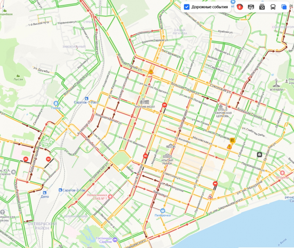 Затруднено движение на Чернышевского по направлению к мосту "Саратов - Энгельс", по улице Орджоникидзе и проспекту Энтузиастов по направлению в Заводской район, проспекту 50 лет Октября, Тракторной и в районе "Стрелки", а также на Шехурдина, Панфилова, Гвардейской, Песчано-Уметской и Сокурском тракте.