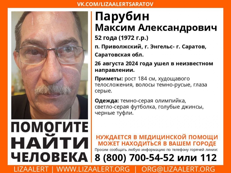 В Саратовской области пропал 52-летний Максим Парубин. Об этом сообщает поисковый отряд "Лиза Алерт Саратов".