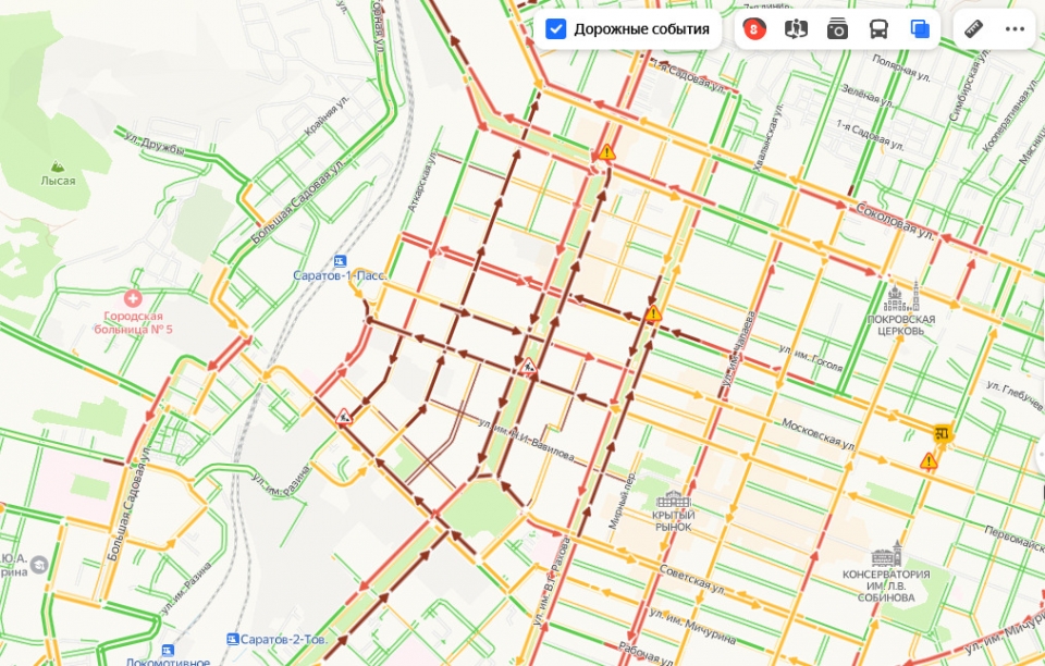 В предпраздничный укороченный рабочий день жители Саратова пытаются добраться домой через серьезные дорожные заторы. Сервис "Яндекс.Пробки" оценивает ситуацию в городе на 8 баллов из 10.