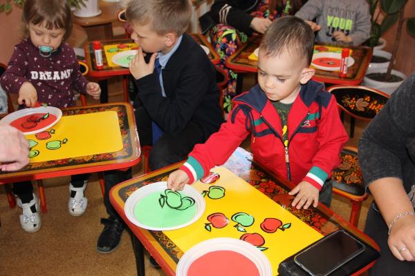 На занятии малыши прослушали сказку «Яблонька», с помощью родителей учились раскладывать яблоки по цвету, собирать пазлы – картинку «Яблоко» из отдельных частей, делать объёмную аппликацию, наклеивая яблочки на дерево, работать в группе.