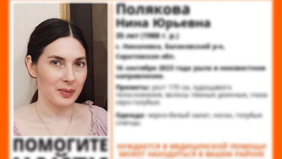 Волонтеры прекратили поиск 35-летней Нины Поляковой , ушедшей из дома в селе Николаевка Балаковского района 16 сентября. Отмечалось, что она нуждается в медпомощи.