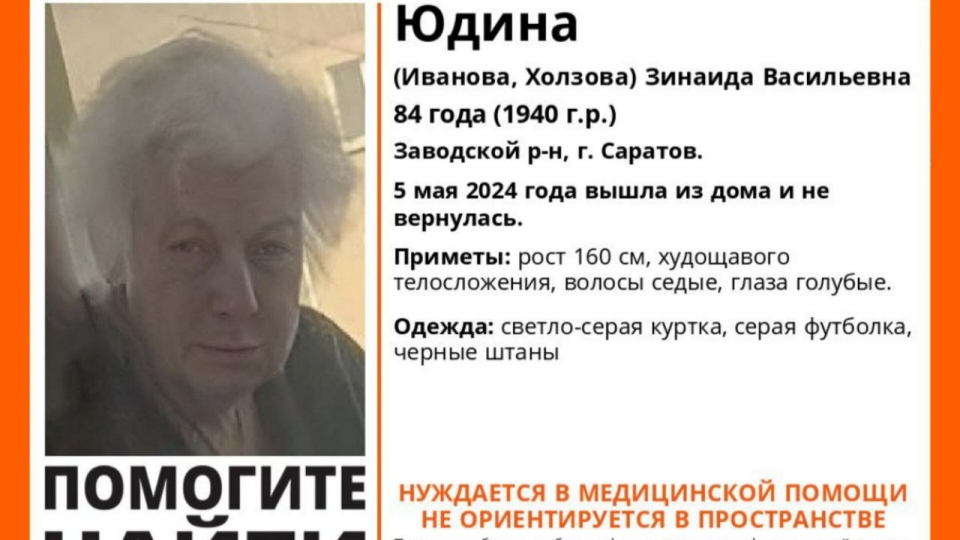 В Саратове прекращены поиски 84-летней Зинаиды Юдиной ( Ивановой , Холзовой ). Об этом сообщает поисковый отряд "Лиза Алерт Саратов".