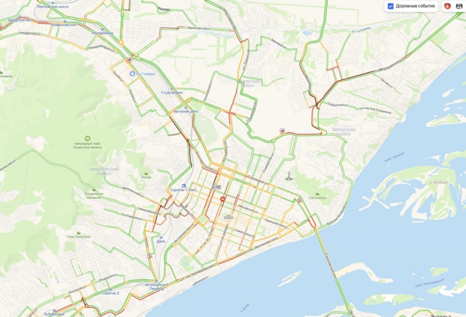 Сегодня утром жители Саратова пытаются добраться на работу через серьезные дорожные заторы. Сервис "Яндекс. Пробки" оценивает ситуацию в городе на 8 баллов из 10.
