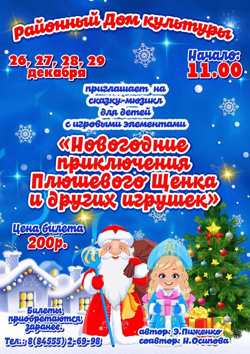 Дата проведения: 26, 27, 28 и 29 декабря в 11.00. Цена билета: 200р. Телефон для справок: 8 (84555) 2-69-98.