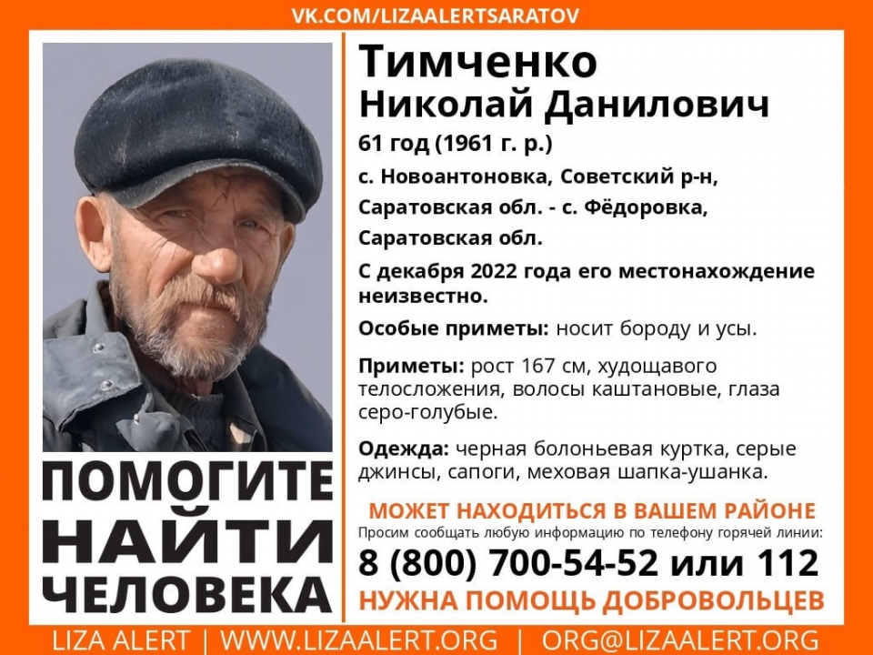 В Саратовской области без вести пропал 61-летний Николай Тимченко . Об этом сообщает отряд "Лиза Алерт Саратов"