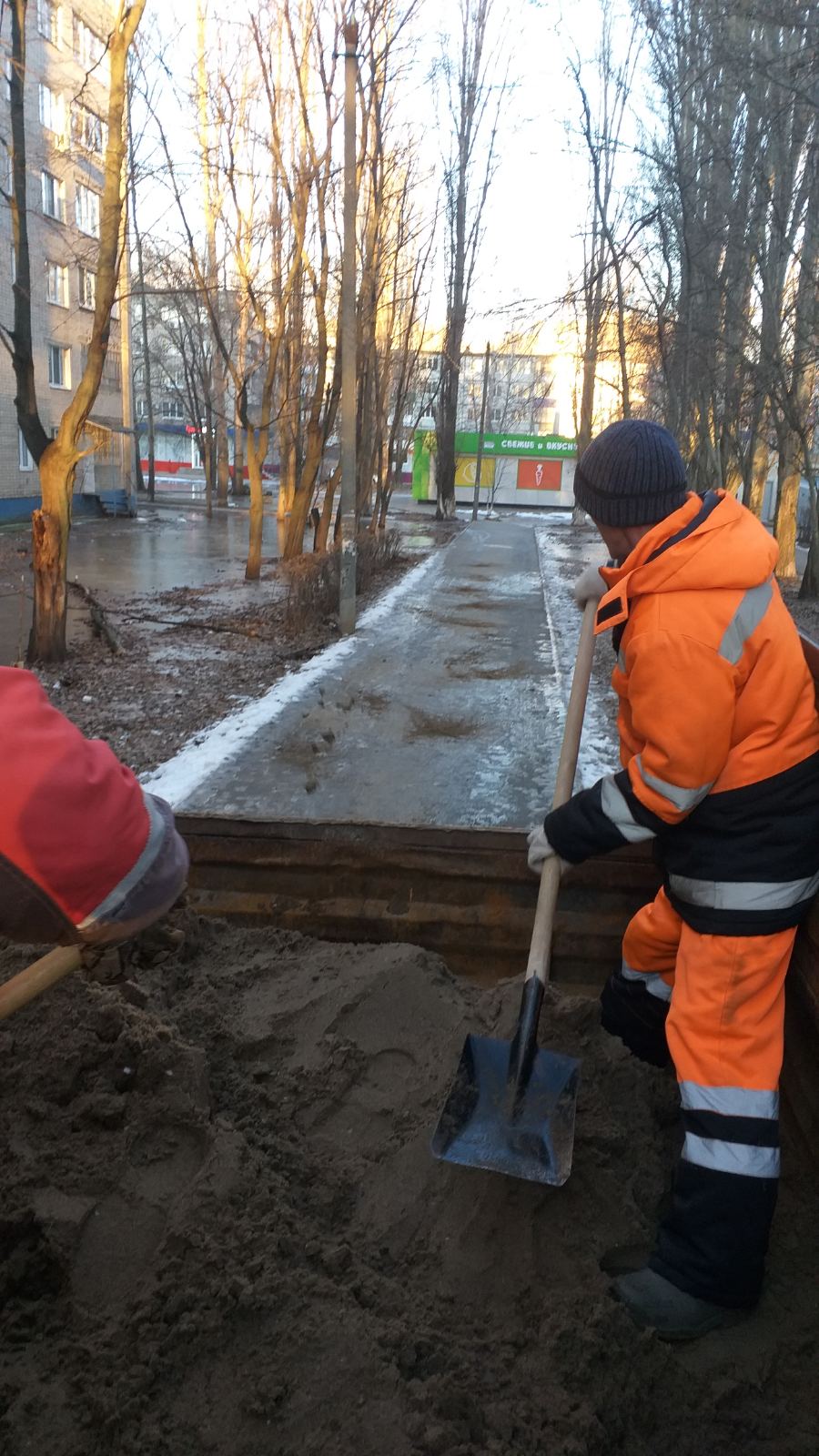 Сотрудники Комбината благоустройства посыпают дороги и тротуары, а также проводят работы по откачке талых вод
