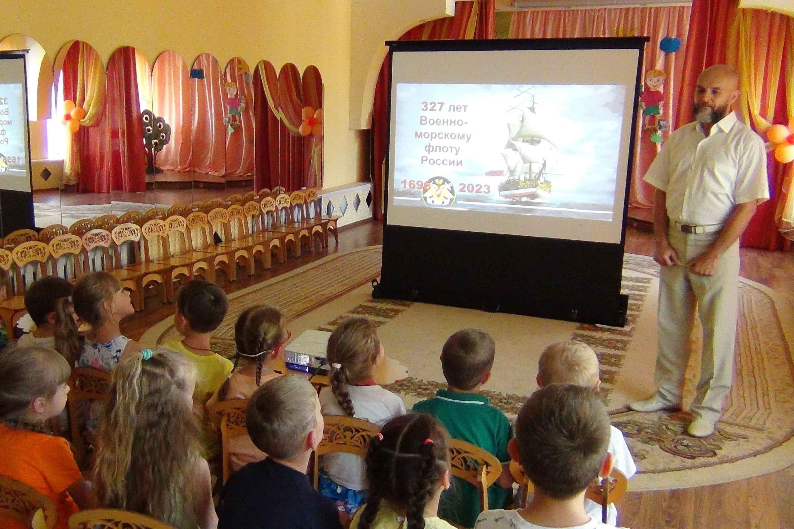 Для воспитанников подготовительных групп детского сада "Светлячок" прошла тематическая беседа "По морям, по волнам!", посвящённая Дню Военно-морского флота России. Мероприятие подготовил и провёл руководитель клубного формирования "Краеведение" Дома культуры Сергей Околитенко.