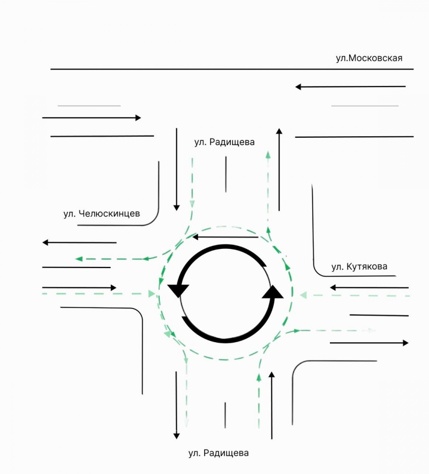 С целью ликвидации места концентрации ДТП на пересечении улиц Радищева, Кутякова и Челюскинцев будет организовано круговое движение.