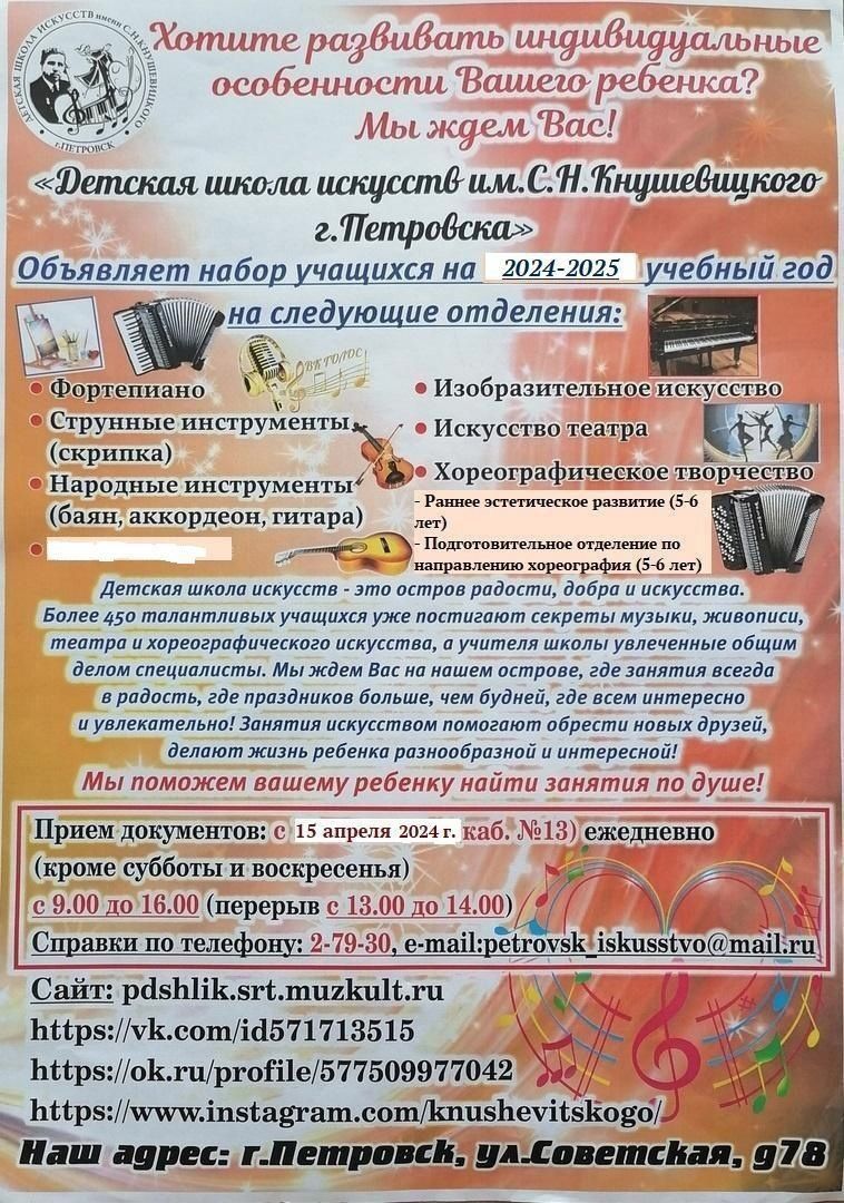 ГУ ДО "ДШИ им. С.Н. Кнушевицкого г. Петровска Саратовской области" объявляет набор учащихся по следующим программам:
