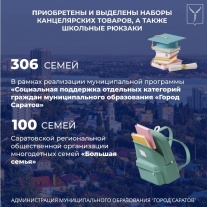 В преддверии Дня знаний, в рамках реализации муниципальной программы «Социальная поддержка отдельных категорий граждан муниципального образования «Город Саратов» комитетом по труду и социальному развитию приобретены и выделены наборы канцелярских товаров, а также школьные рюкзаки для вручения детям из семей мобилизованных военнослужащих, участников специальной военной операции, детей из малообеспеченных семей, а также Саратовской региональной общественной организации многодетных семей «Большая семья».