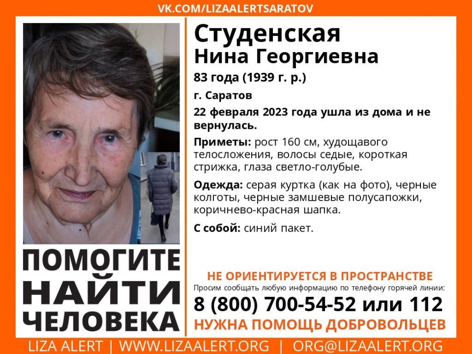 Сегодня утром в Саратове пропала 83-летняя Нина Студенская . Об этом сообщает поисковый отряд "Лиза Алерт Саратов".