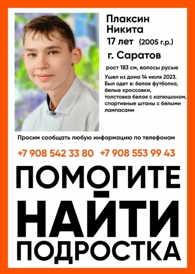 В Саратове уже несколько дней ищут 17-летнего Никиту Плаксина . Появившуюся в соцсетях информацию ИА "Взгляд-инфо" подтвердили в пресс-службе регионального ГУ МВД.