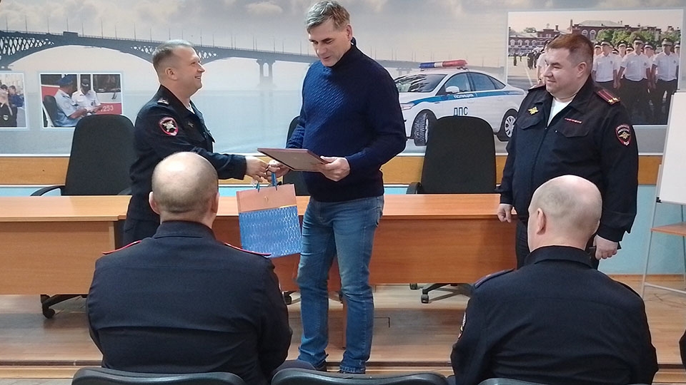 Командир полка ДПС городской Госавтоинспекции полковник полиции Виталий Капцов лично вручил саратовцу благодарственное письмо и поздравил с наступающим Новым годом.