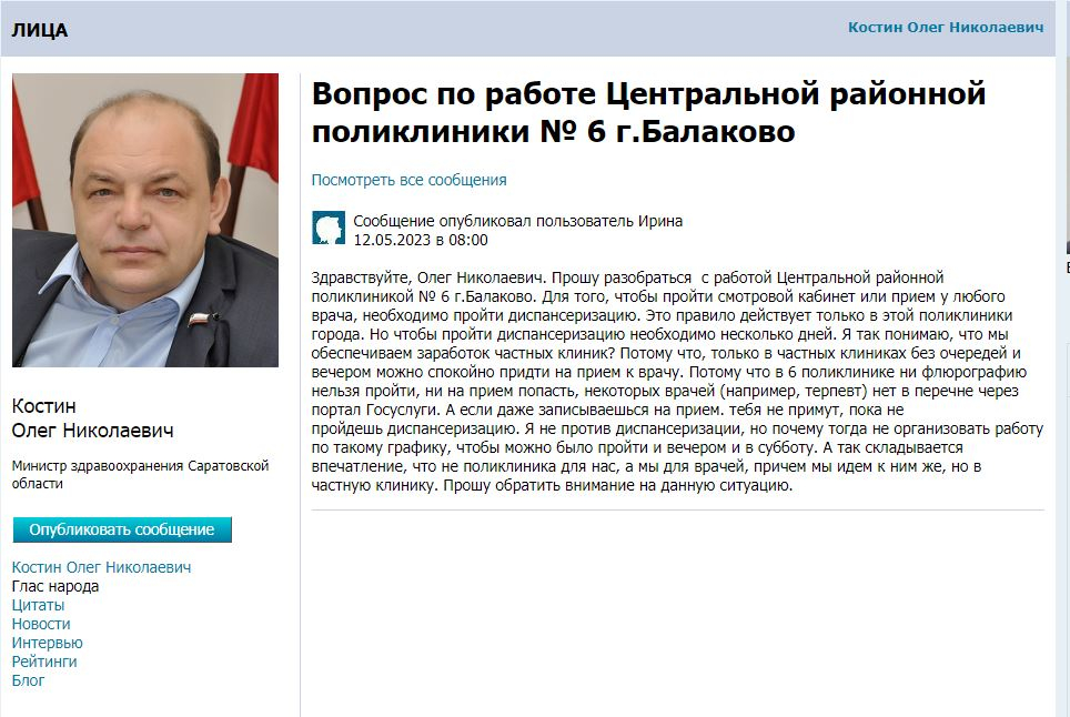 Сегодня на портале « Лица » появилось обращения от пользователя «Ирина», адресованное министру здравоохранения Саратовской области Олегу Костину.