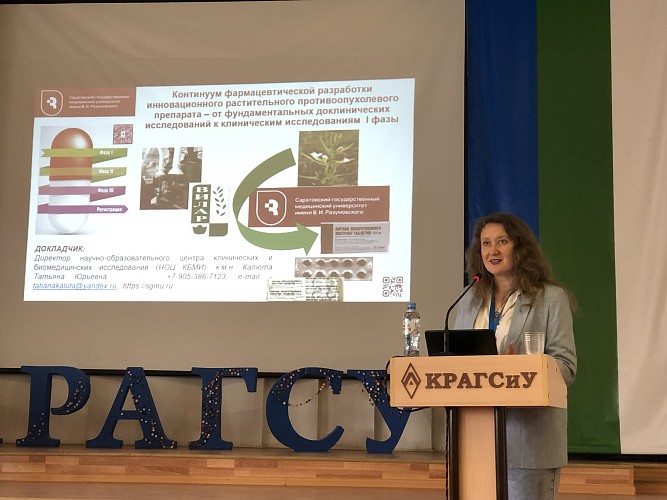 На пленарном заседании выступила директор научно-образовательного центра клинических и биомедицинских исследований Татьяна Калюта с докладом «Континуум фармацевтической разработки инновационного растительного противоопухолевого препарата: от фундаментальных доклинических исследований к клиническим исследованиям I фазы». Основные этапы фармацевтической разработки препарата на основе аврана лекарственного были представлены в докладе доцента кафедры фармацевтической технологии и биотехнологии Юлии Фоминой. Фармацевтическая разработка лекарственного средства на основе аврана является флагманским проектом университета, разработки ведутся в рамках стратегического проекта «Университет – инкубатор технологий и кадров для фармацевтики и биоинженерии» по программе «Приоритет 2030».