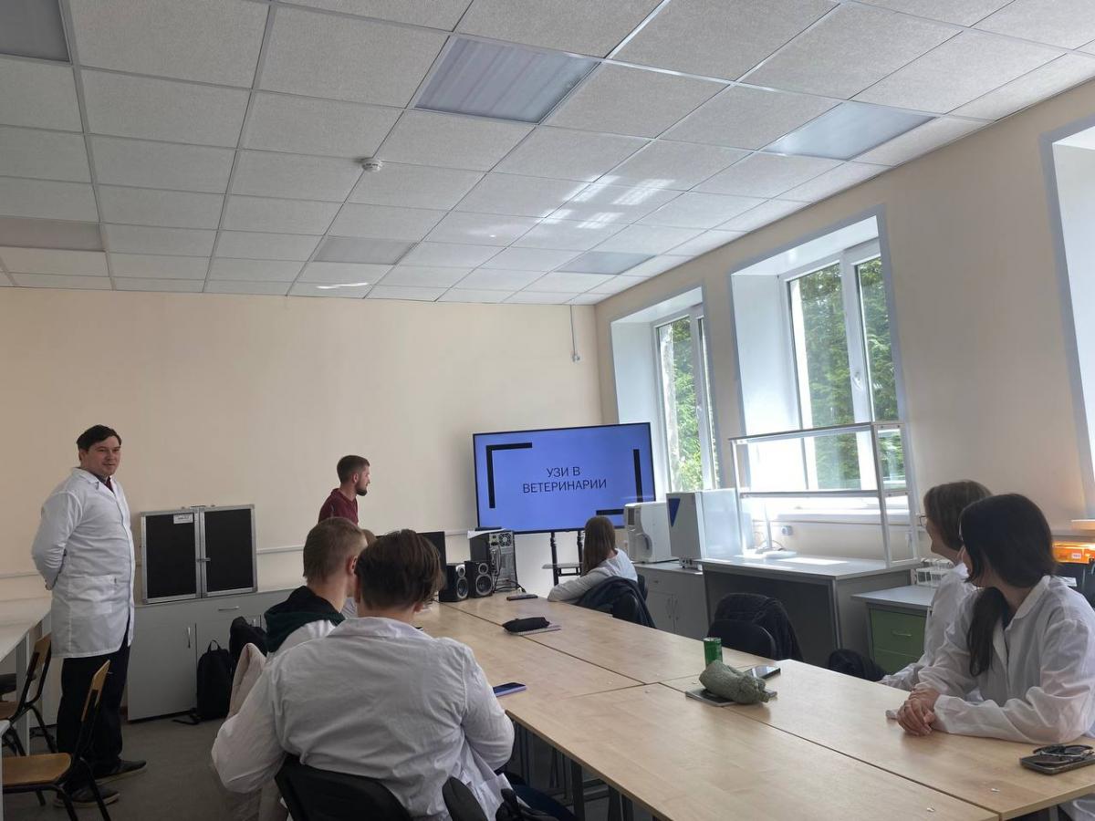Обучающимся группы ВТ-20203 ФП "Профессионалитет" на практическом занятии по ПМ. 02 Проведение профилактических, диагностических и лечебных мероприятий преподавателем Веселовским Степаном Юрьевичем было рассказано о проведении УЗИ диагностики у животных. Врач ультразвуковой диагностики - Ломакин Игнат Сергеевич, работающий в ветеринарной клинике ИП Казаков А. А. показал презентацию о том, какие встречаются патологии органов брюшной полости: почек, кишечника, поджелудочной железы, показал как выглядят камни при использовании УЗИ аппарата. Полученные знания обучающиеся смогут применить для правильной поставки диагноза различных болезней животных.