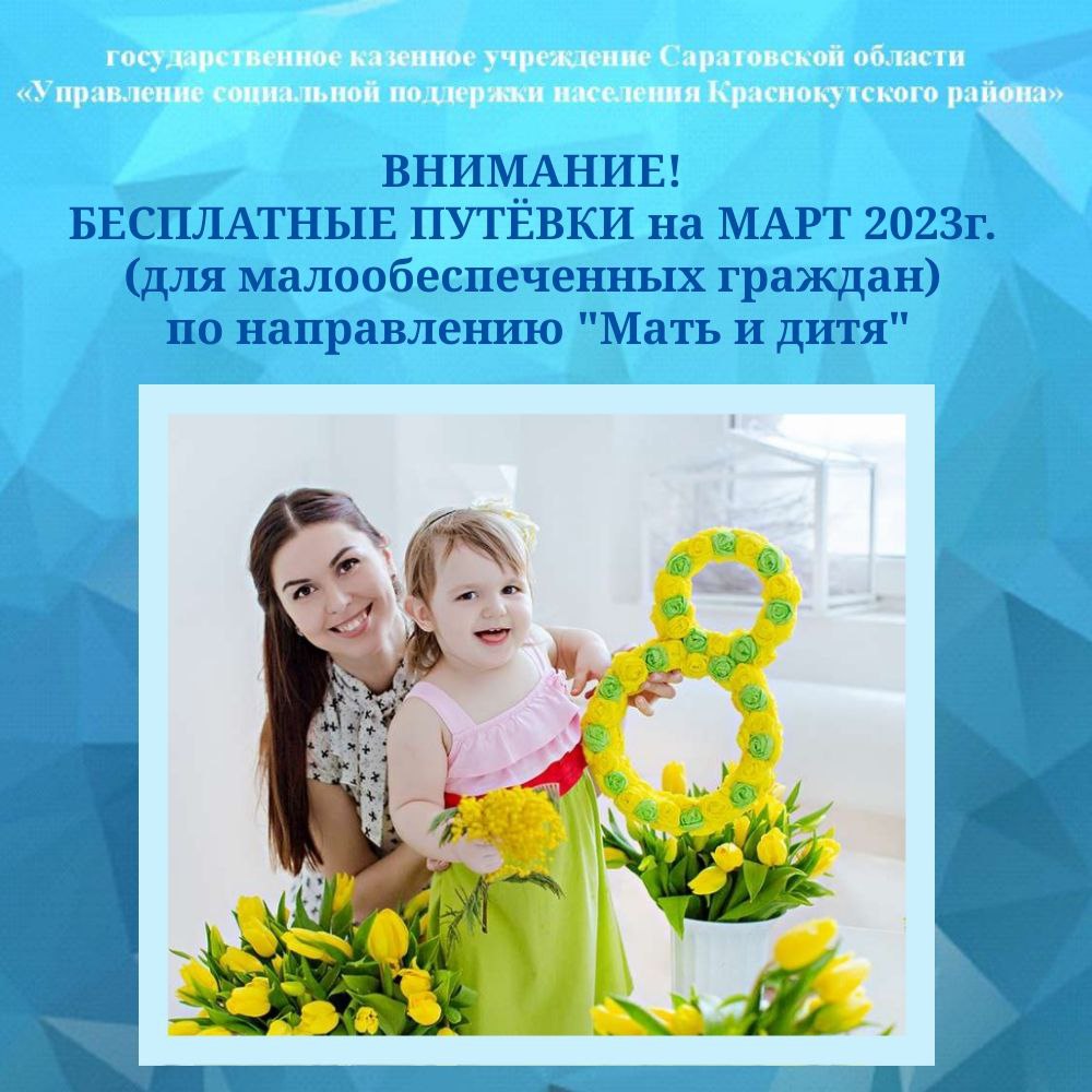 Управление социальной поддержки населения Краснокутского района предлагает мамам вместе с детьми встретить замечательный весенний праздник 8 марта в социально - оздоровительном центре Саратовской области «Пугачевский».