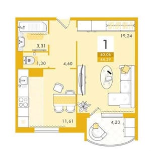 - Жилая площадь: 19 м²