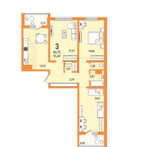 - Общая площадь: 91.5 м²