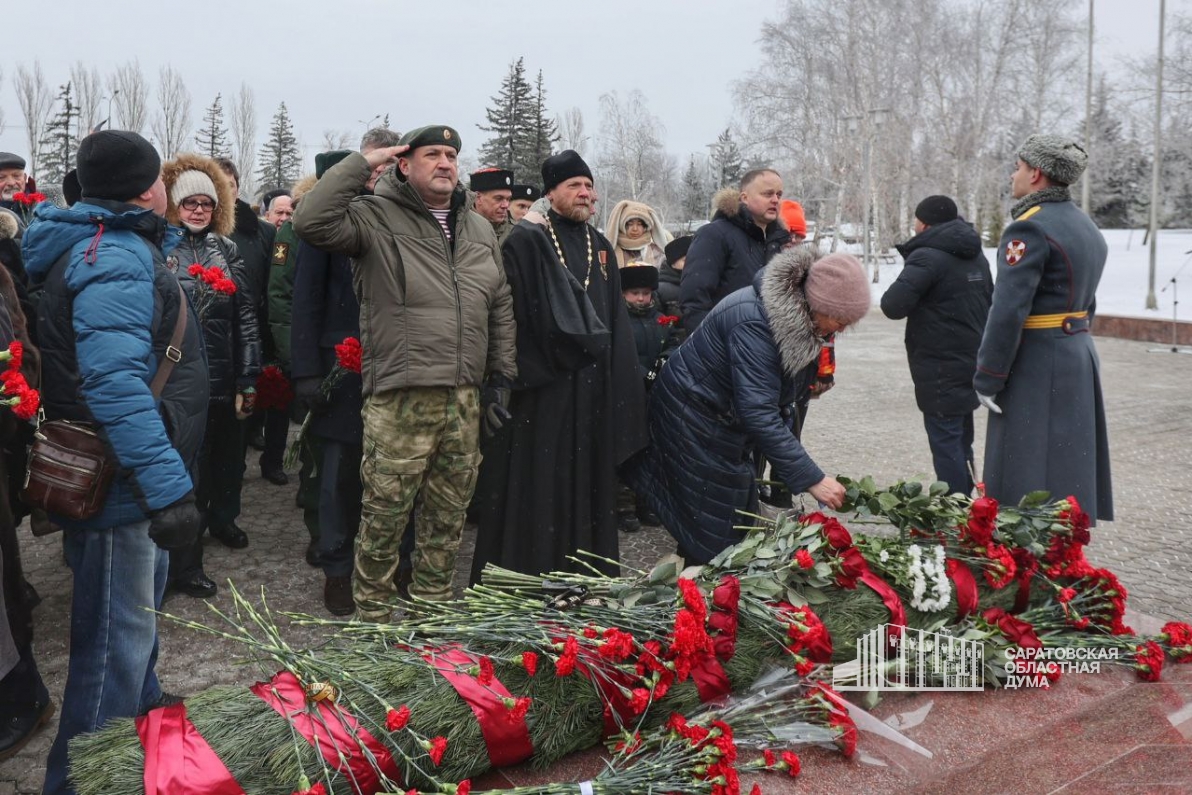 На Соколовую гору пришли ветераны войны, родные и близкие павших героев СВО. На плиты памятника «Землякам, погибшим в локальных войнах» были занесены порядка двухсот имен саратовцев, погибших в спецоперации. Их память почтили минутой молчания.