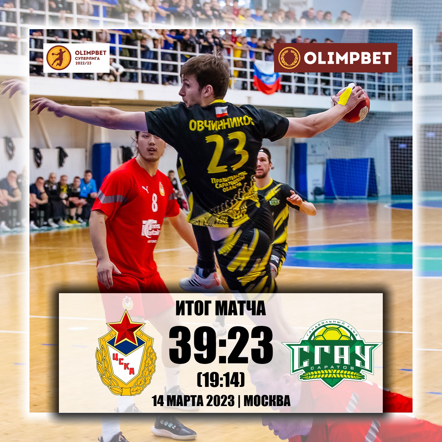 Равная борьба в матче была примерно до 25 минуты матча, после чего "армейцы" оторвались в счёте. Итог матча 39:23 в пользу ЦСКА. ЛУчшим игроком матча в составе "жёлто-чёрных" был признан голкипер Никита Осипов, отразивший восемь бросков по своим воротам.